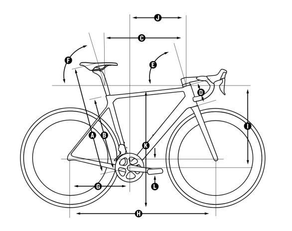サイズ 18 A:シートチューブ芯-トップ(mm) 450 B:トップチューブ※水平換算(mm) 610 C:ヘッド長(mm) 110 D:ヘッド角(度) 69 E:シート角(度) 73 F:フロントセンター(mm) 684 G:リアセンター(mm) 460 H:BB下り(mm) 70 I:スタック(mm) - J:リーチ(mm) - K:フォークオフセット(mm) 44